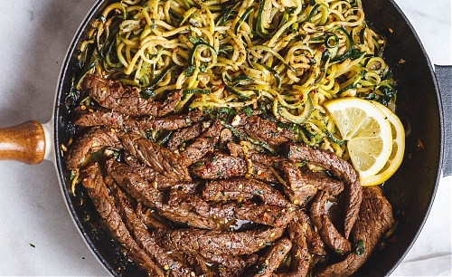 Вместо бульона можно использовать белое сухое вино. Необязательно резать стейк до жарки, если хотите — нарежьте на полоски после. При приготовлении цуккини выделяется много воды, поэтому после того, как вы их нарезали, посыпьте солью и оставьте на несколько минут. Затем хорошо промойте.