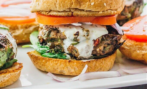 Самое потрясающее в этих бургерах — сушеные томаты и сыр фета, вкус которых дополняет шпинат и соус. Убийственное сочетание.
