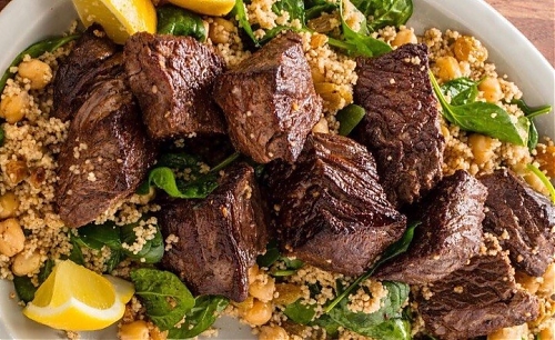 Секрет этого рецепта — кускус, который варится в той же сковороде, где жарился стейк. Это наполняет его мясным насыщенным вкусом.