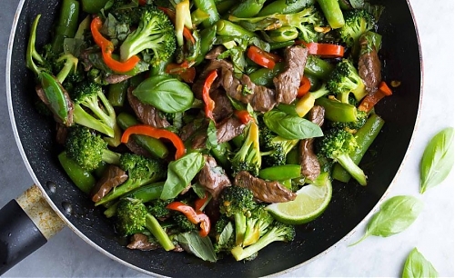 - На сковороду к соусу добавьте овощи, полоски стейка и листья базилика. Хорошо перемешайте и тушите пару минут.