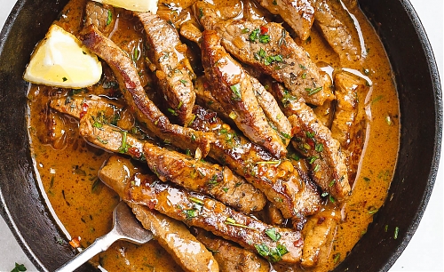 - Переложите кусочки стейка обратно в сковороду, полейте сверху соусом и посыпьте петрушкой.