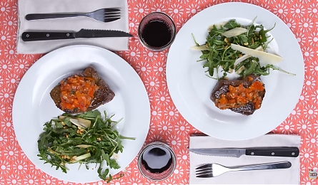 Простой рецепт для вкусного ужина на двоих: стейк из костреца Праймбиф, легкий салат и овощной соус.