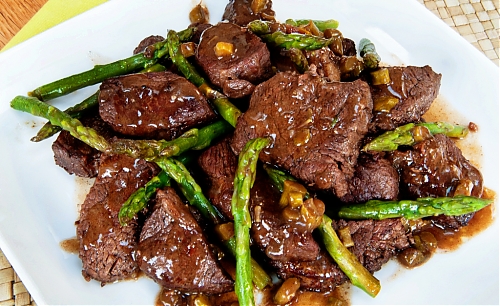 - Подавайте кубики стейка со спаржей, полив соусом.