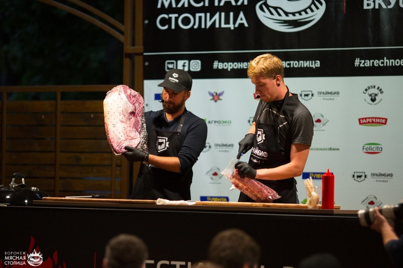 Первый мастер-класс «BBQ SET» проводят шефы питерского ресторана «SMOKE BBQ» Алексей Буров и Алексей Каневский — они готовят брискет из мраморной говядины «Праймбиф» и свиных ребер «АГРОЭКО». Брискет — это копченая грудинка, ставшая наиболее популярным блюдом фудкорта. Он готовился в мобильном смокере, который «SMOKE BBQ» специально привезли в Воронеж на День барбекю 8 сентября — первый день фестиваля.