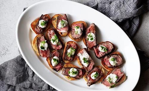 Кростини — это итальянская закуска. Небольшие ломтики хлеба обжаривают и подают с самыми разными продуктами: овощами, мясом, морепродуктами, сыром, фруктами. Мы предлагаем рецепт, конечно же, со стейком.