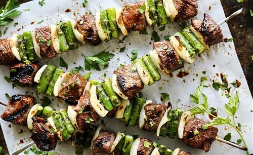 - Нанижите мясо, лук и спаржу на шампура и пожарьте на гриле, разогретом до 200 градусов до желаемой степени прожарки.