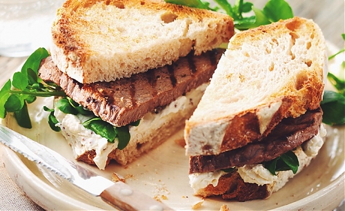 - На чиабатту выкладываем обжаренные стейки, грибы. Для сочности можно полить соком от жарки.